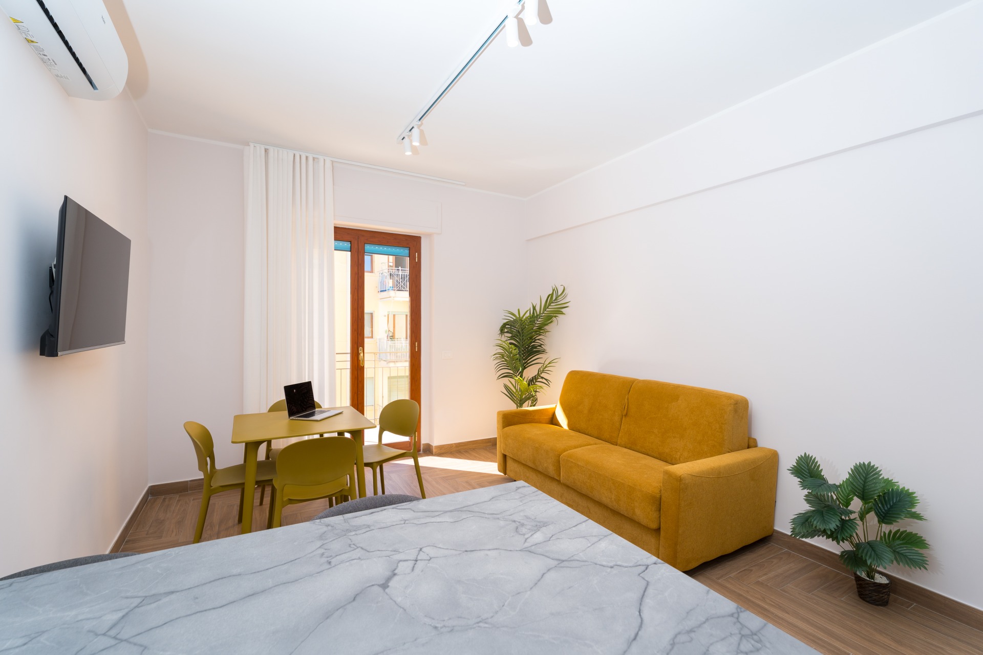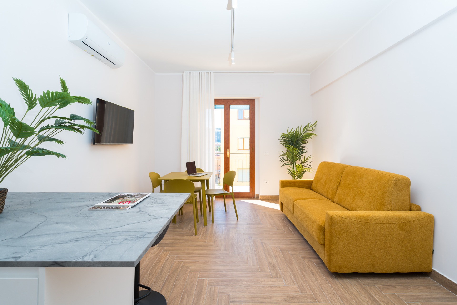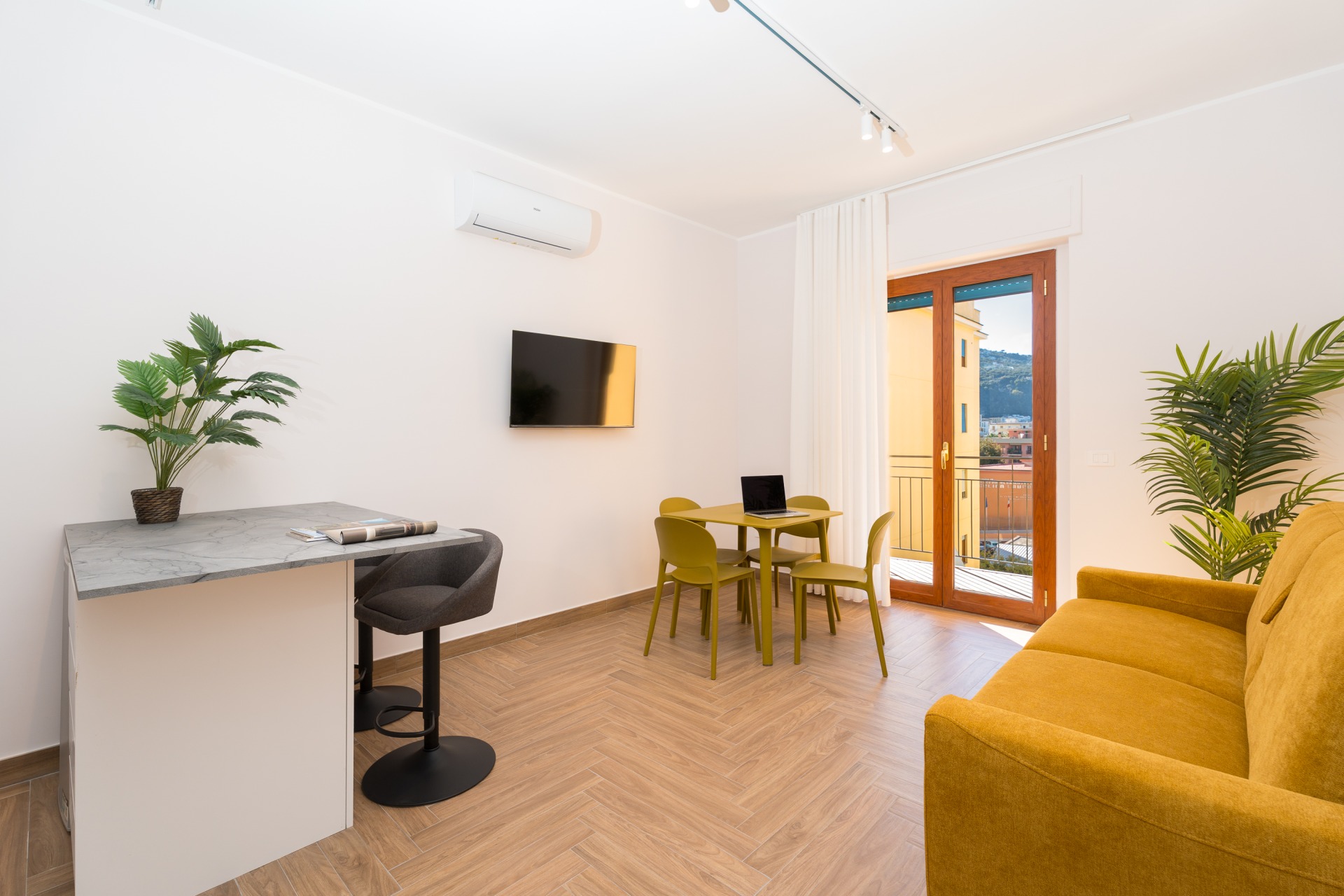 Modern apartment with a bright double bedroom, a spacious living area with a fully equipped kitchen, an elegant bathroom, and a terrace. Newly renovated interiors with designer furnishings, TV, air conditioning, and a washing machine. Perfect for couples, in a convenient location to experience Sorrento with comfort and style.