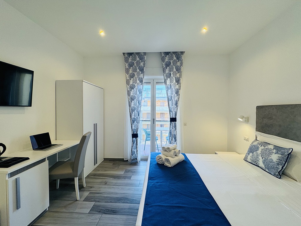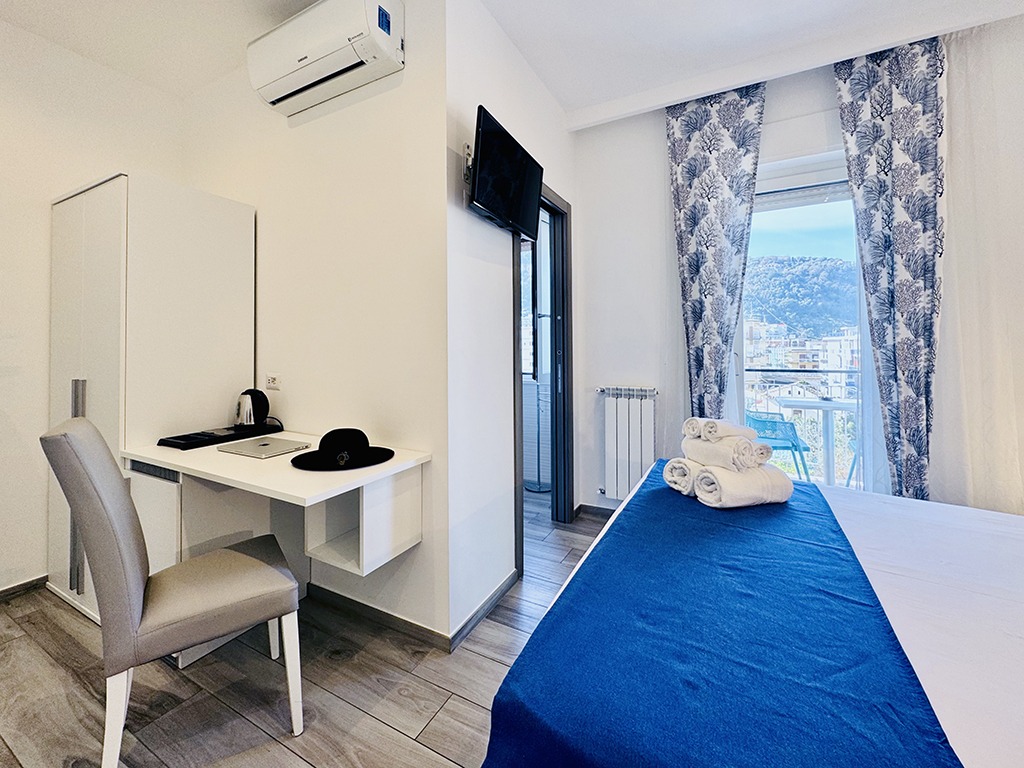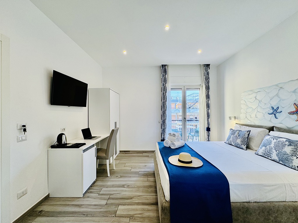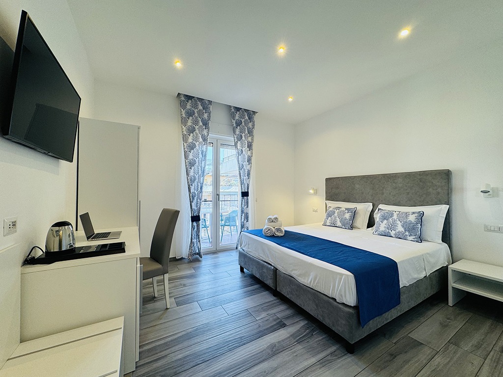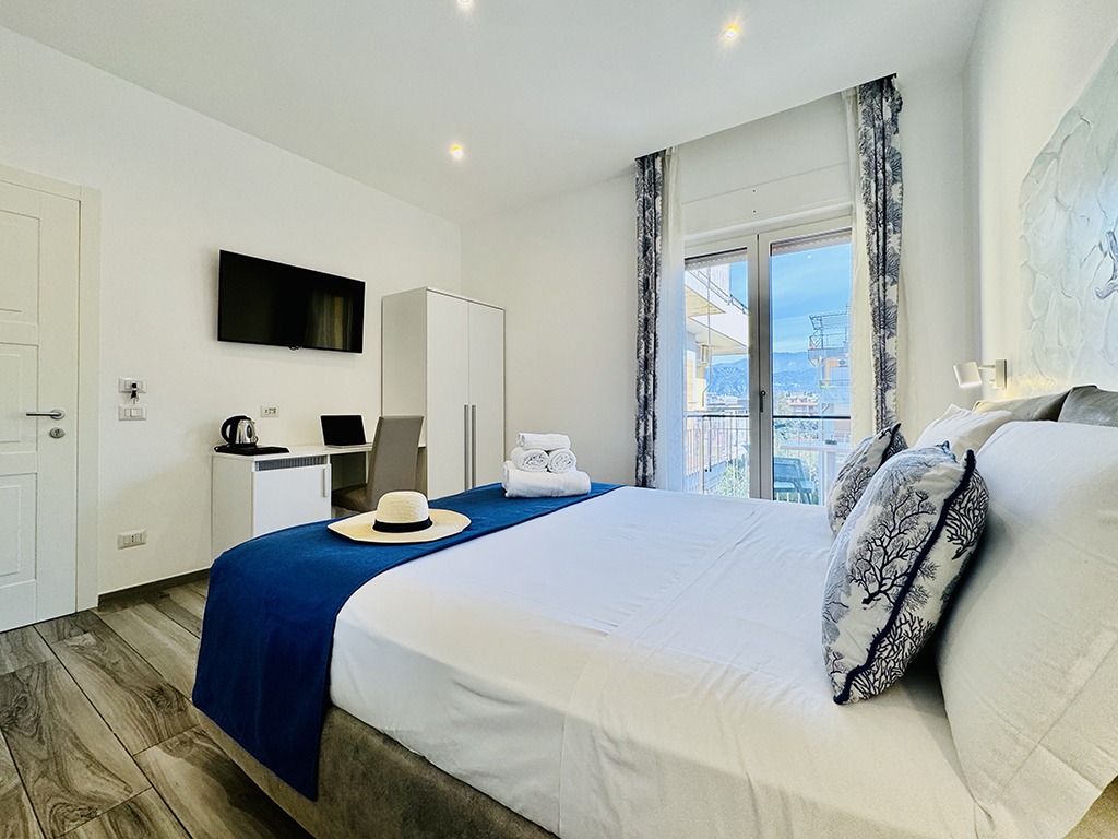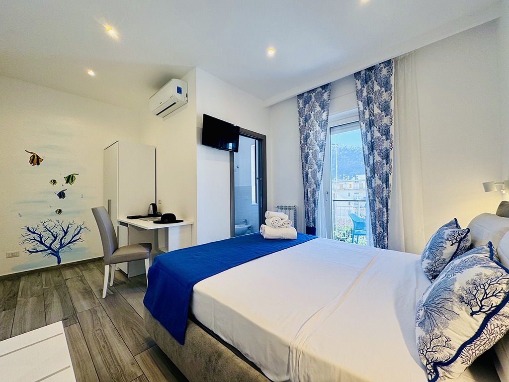 Welcome to our charming Maison degli Aranci b&b nestled in the heart of Sorrento, where comfort meets coastal elegance. Our accommodation features three meticulously designed rooms: Standard, Deluxe, and Superior, each exuding a fresh and functional aesthetic with a nod to the sea through captivating mural decorations. Each room boasts a private bathroom with a refreshing shower, as well as a furnished balcony adorned with a quaint table and chairs, perfect for soaking in the Mediterranean ambiance. Modern amenities include a flat-screen TV, minibar, coffee machine, kettle and a safe for your convenience and peace of mind. Whether you’re seeking a cozy retreat or a luxurious getaway, our Maison degli Aranci b&b promises a memorable stay immersed in the beauty and tranquility of Sorrento.