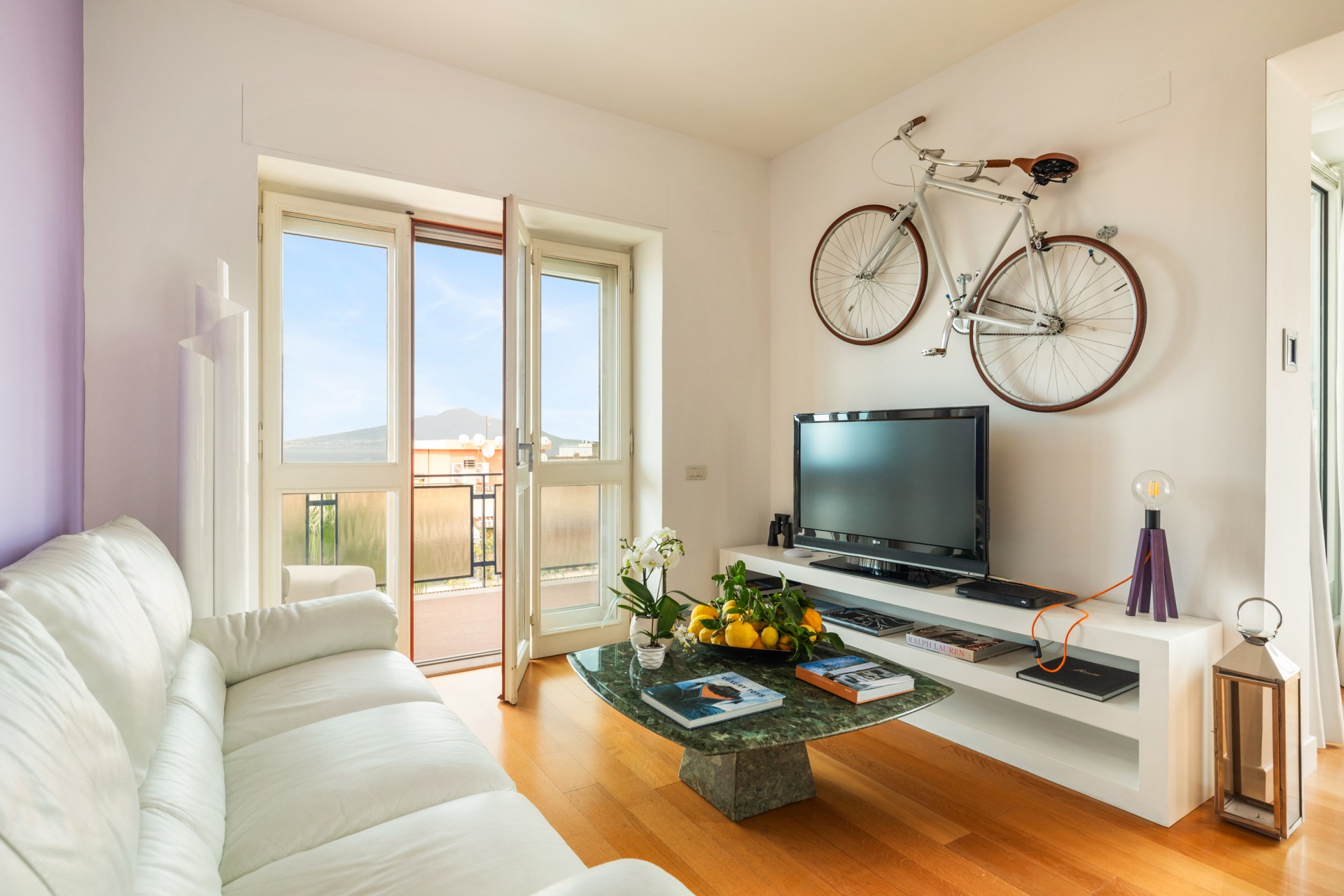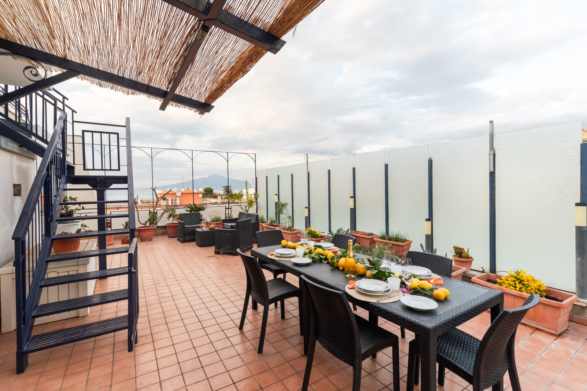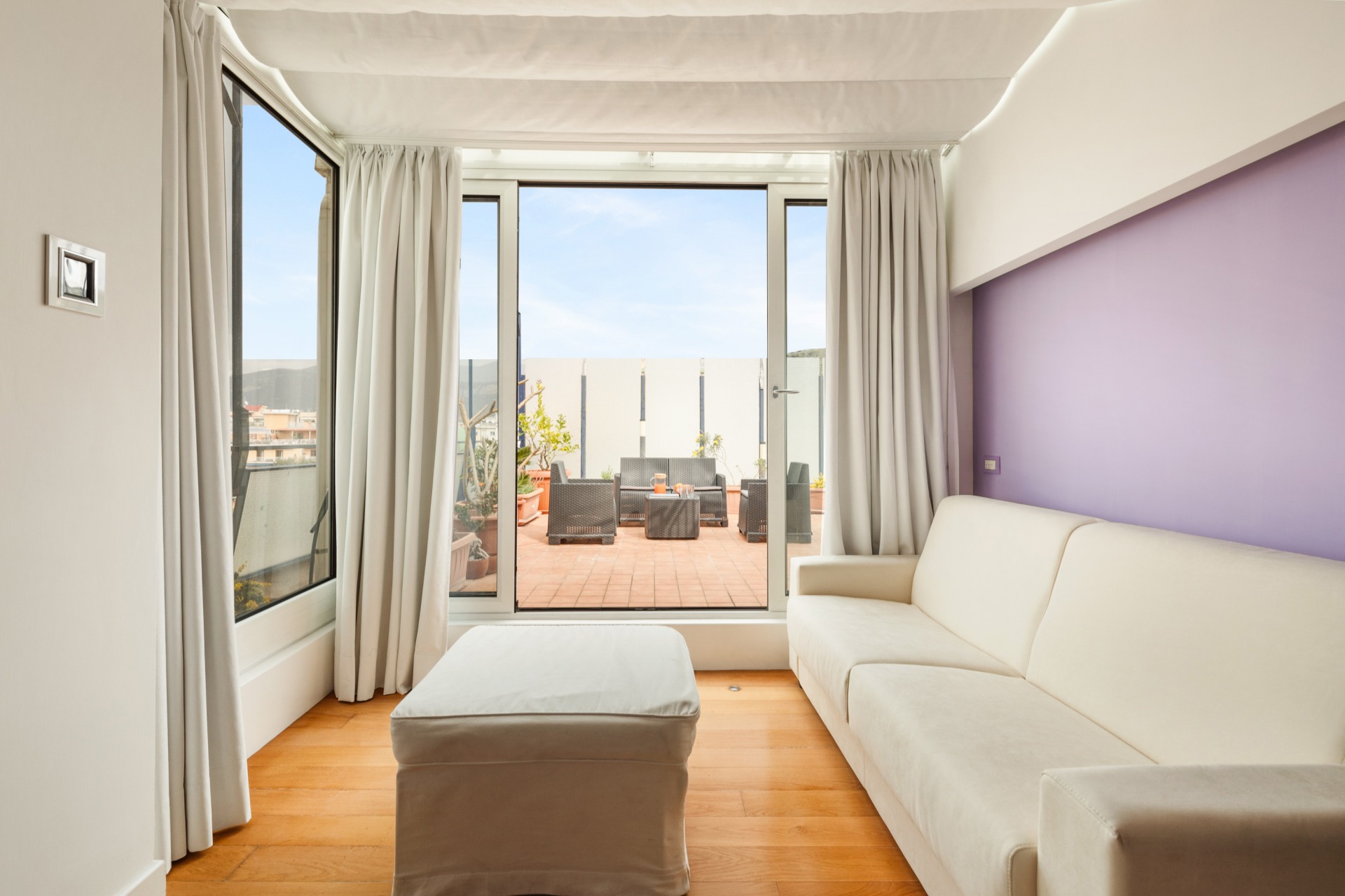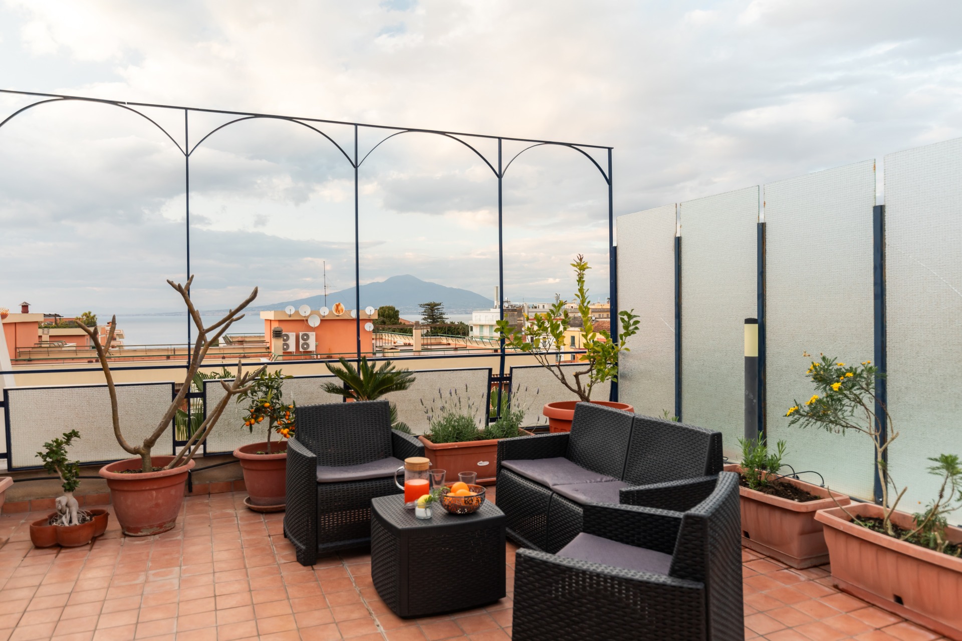Welcome to this elegant and bright penthouse, an oasis of relaxation with breathtaking views of the sea and Mount Vesuvius. Perfectly located, this modern and refined space is ideal for a romantic getaway, a family vacation, or a business stay in total comfort. The furnished patio with lounge area and dining space invites you to unwind. Inside, a spacious open-plan living area with a fully equipped kitchen, a living room with a sofa bed, a double bedroom, and a modern bathroom offer the utmost comfort. Located on the 5th floor, it is easily accessible by elevator.
