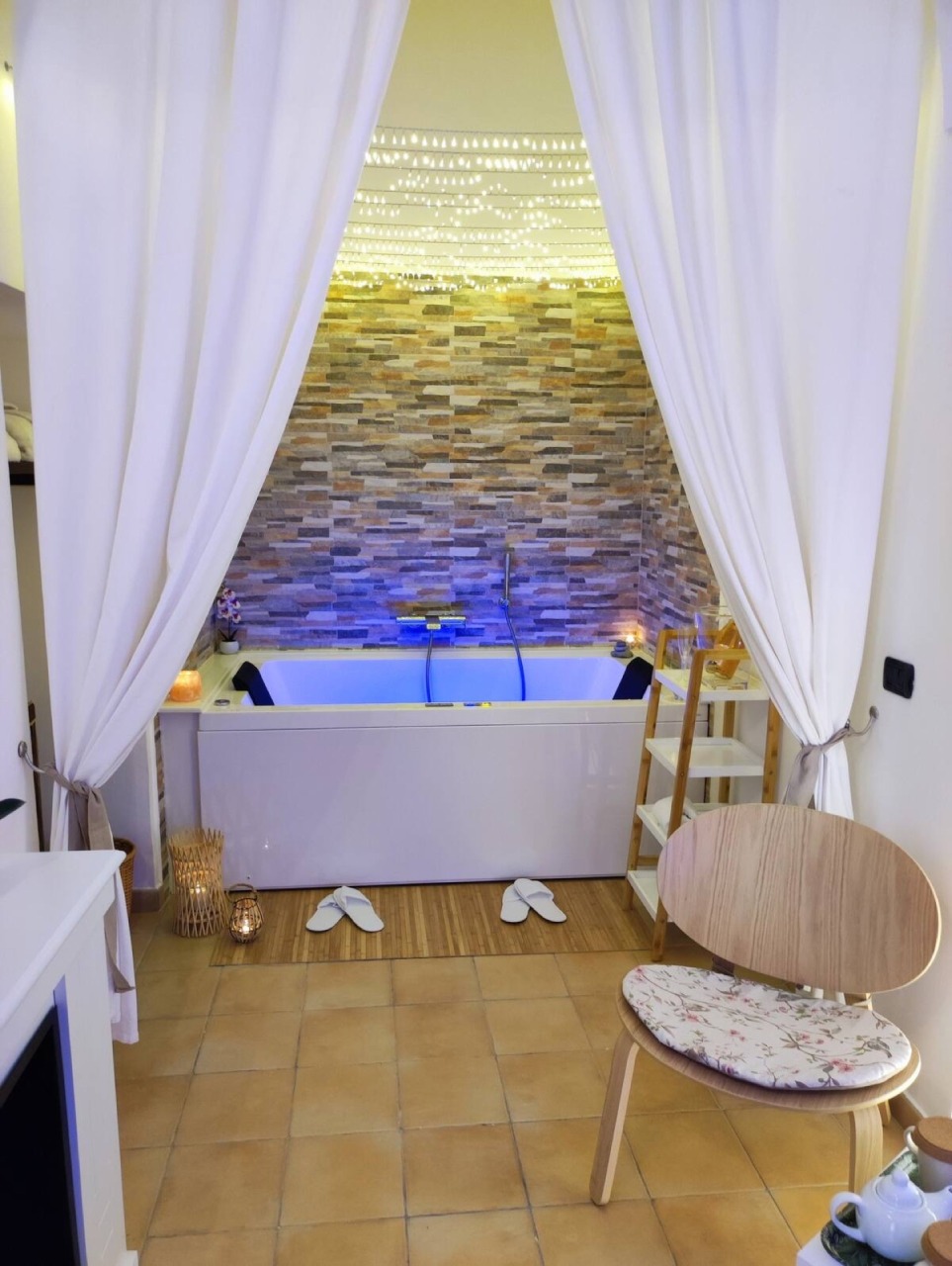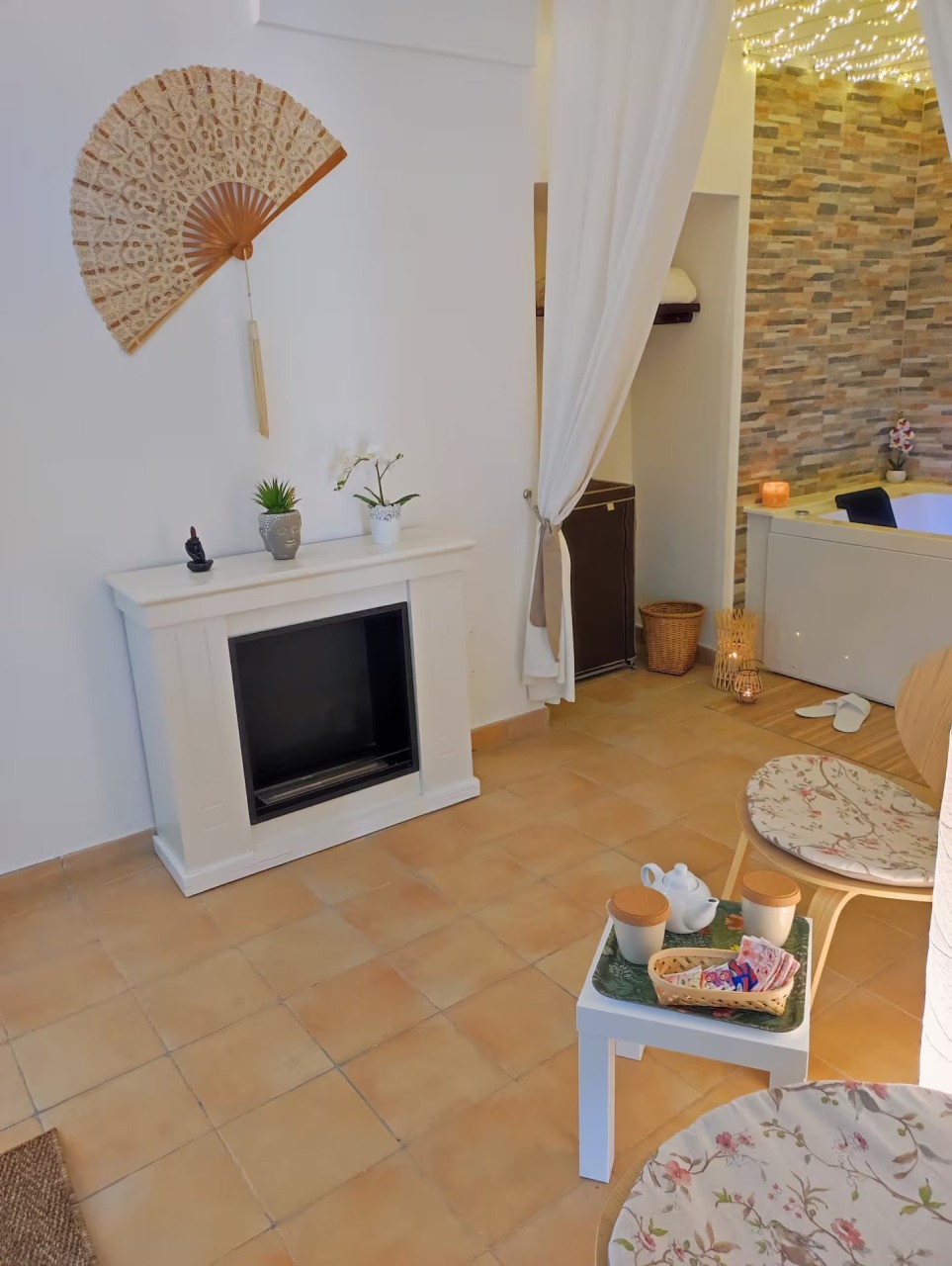 Elegant and private, this apartment offers the utmost comfort. Featuring a heated chromatic hot tub, Bluetooth sound system, chromatic double bed, and bioethanol fireplace, it creates a truly unique atmosphere. The relaxation corner with herbal teas and a welcome bottle of prosecco awaits you. Complete with a fully equipped kitchen, spacious shower, TV, washing machine, and furnished terrace. Free parking available within the private park. A stay of pure well-being.