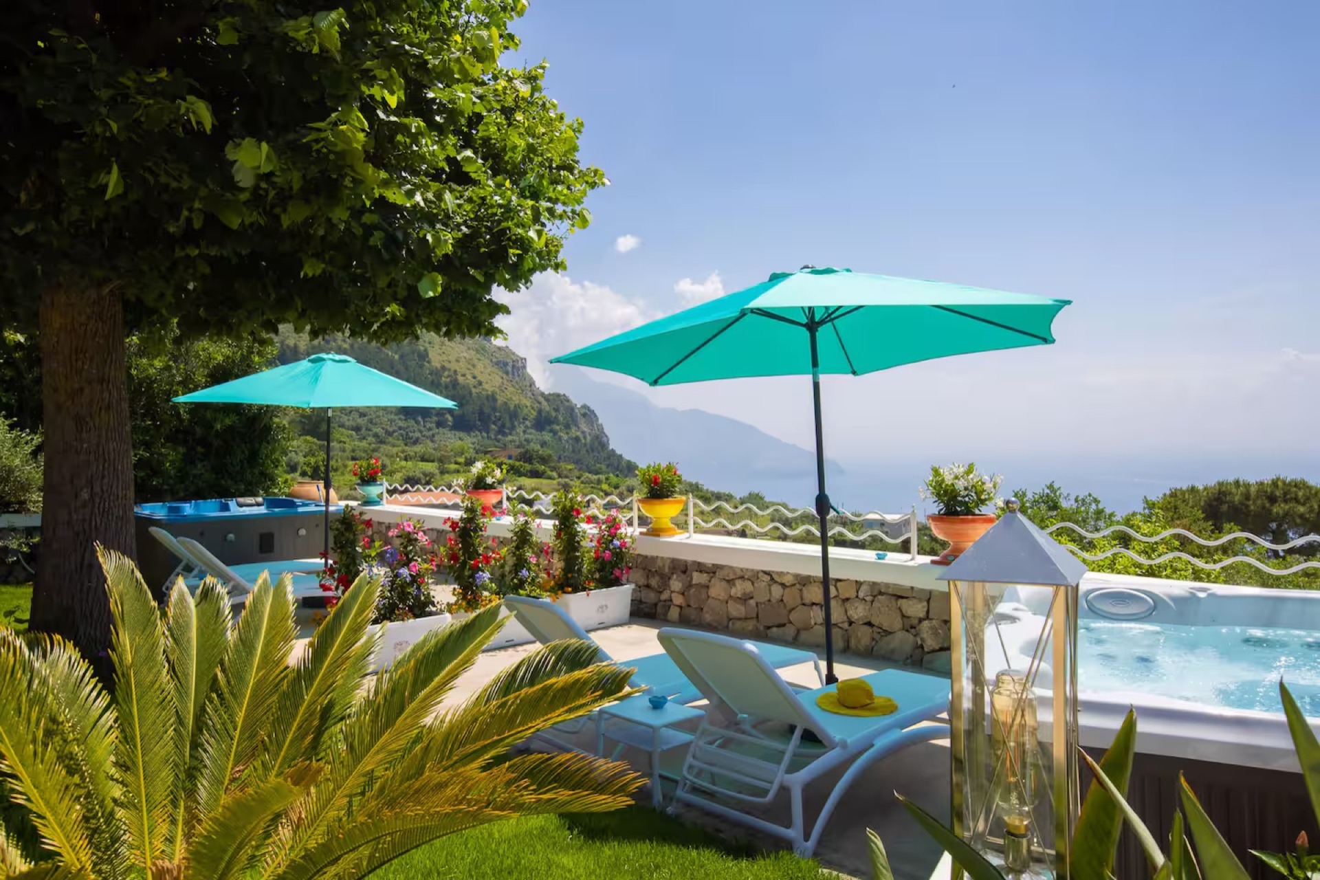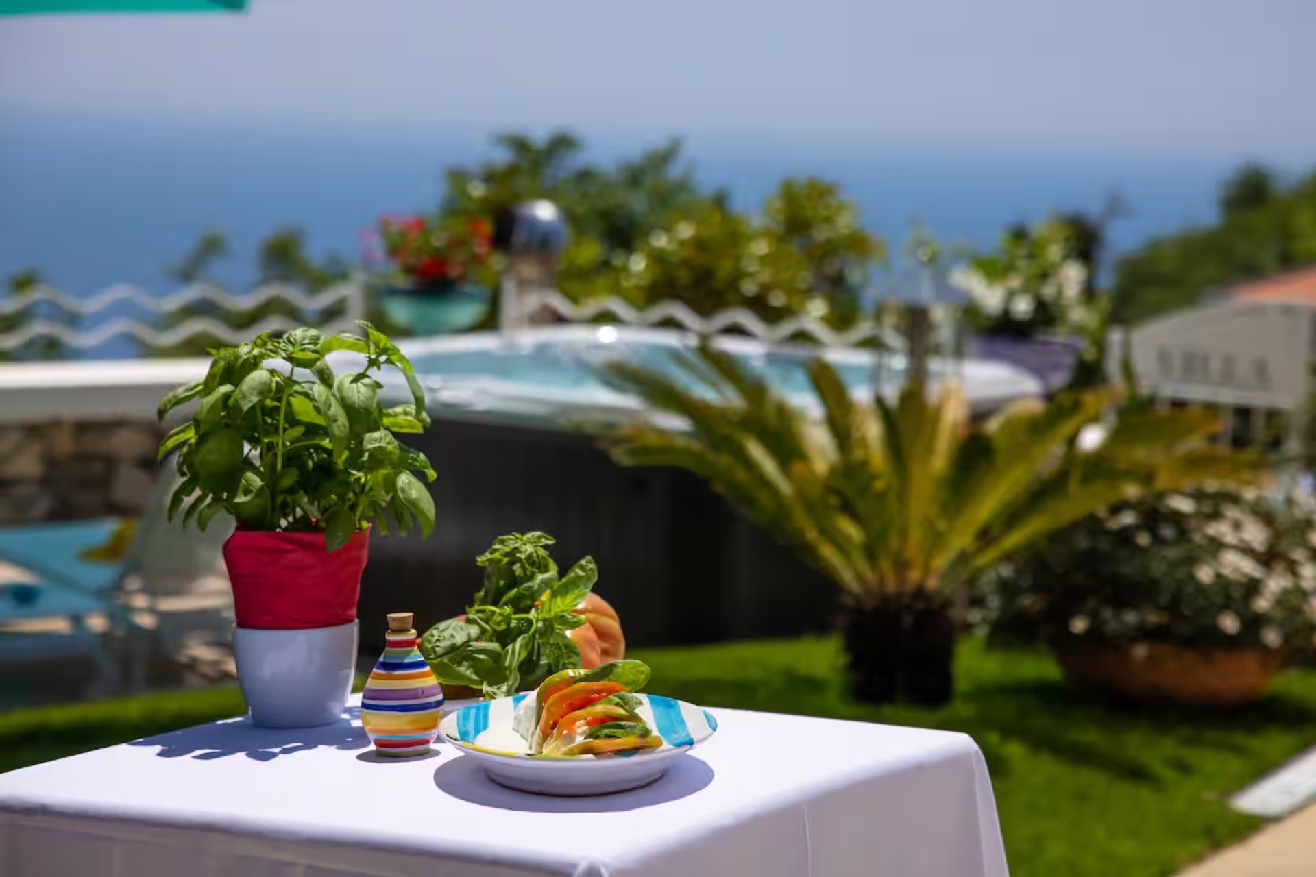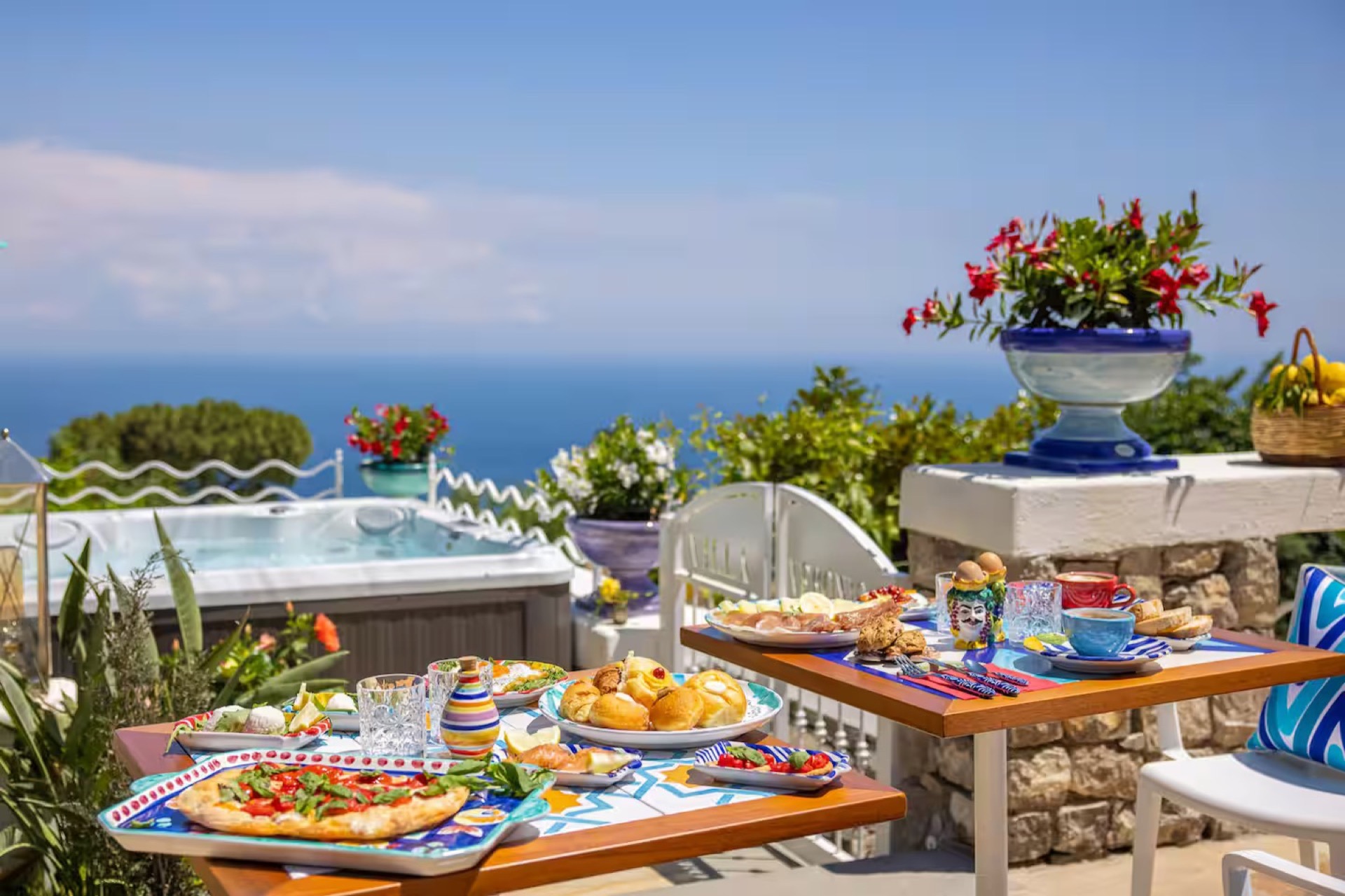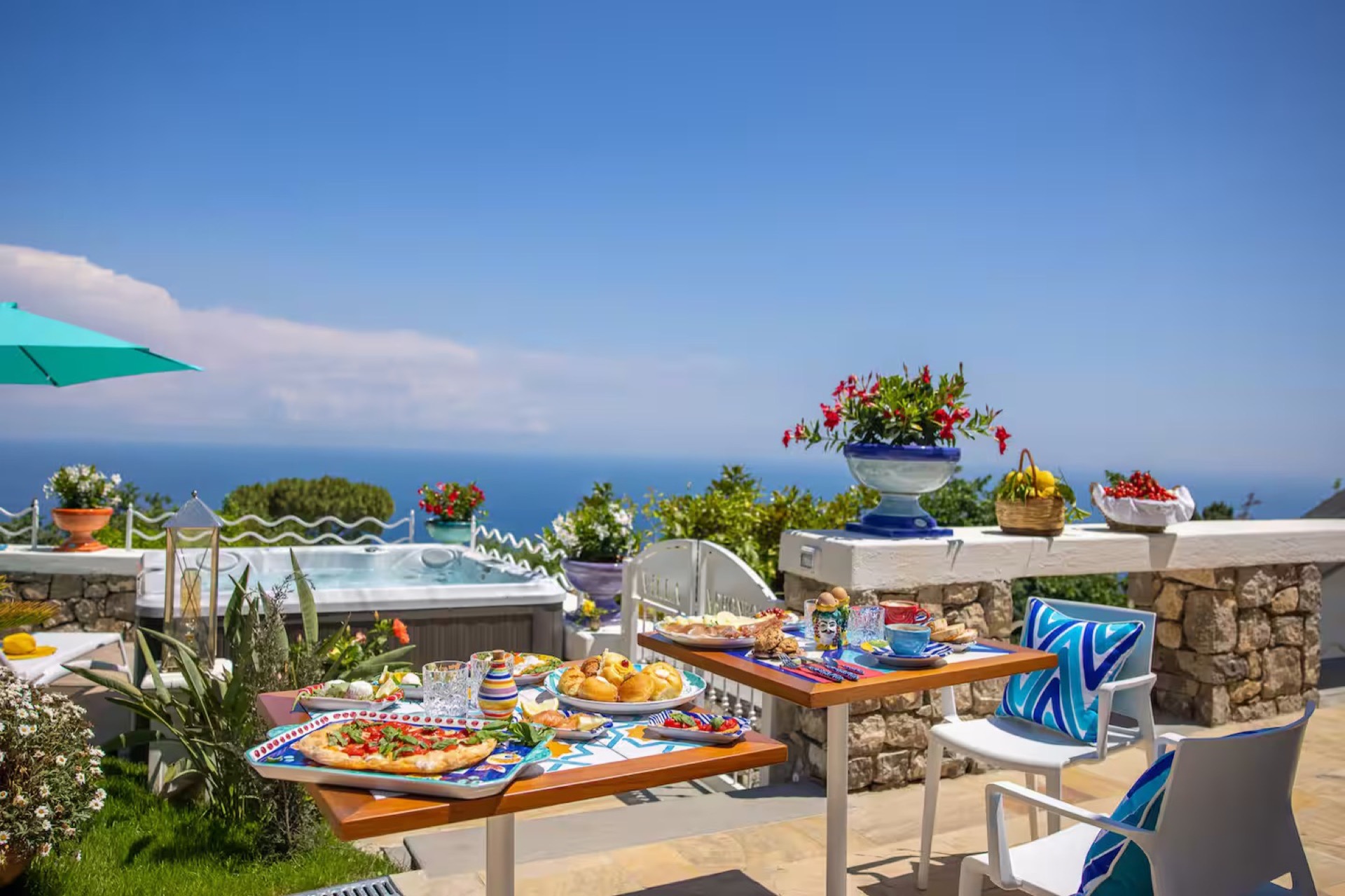 The elegant Positano and Capri Suites, decorated with Vietri ceramics and fine fabrics, provide bright and welcoming spaces, each equipped with a queen-size bed, single sofa bed, and a private heated jacuzzi with sun loungers and an outdoor dining area.