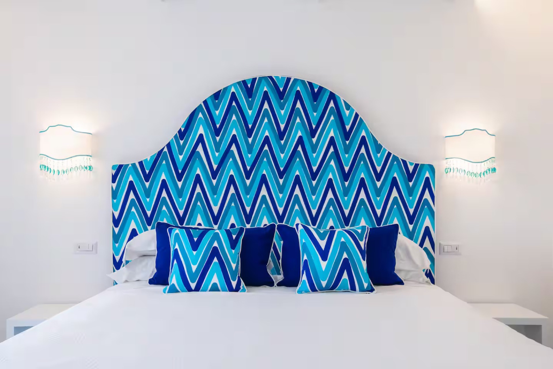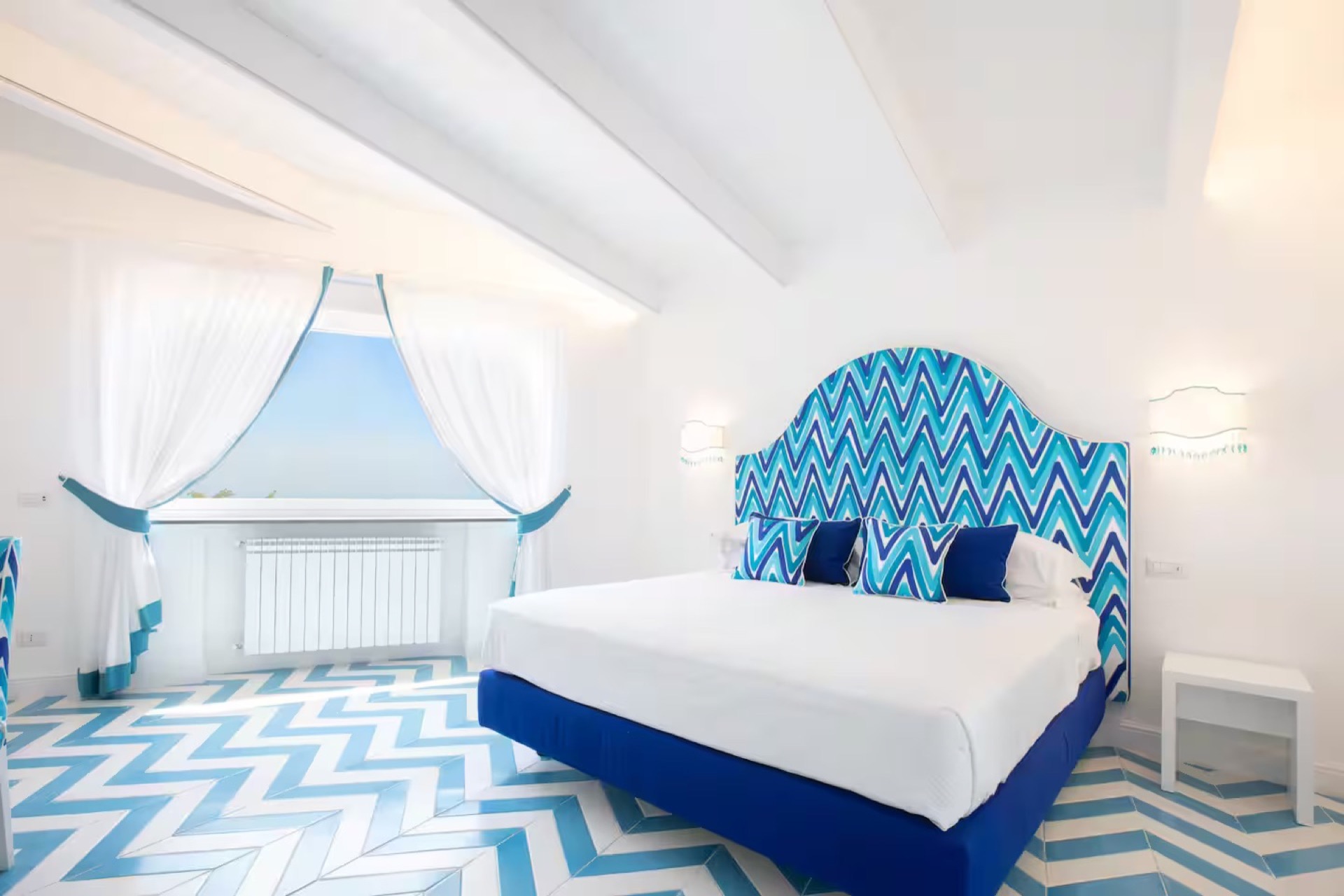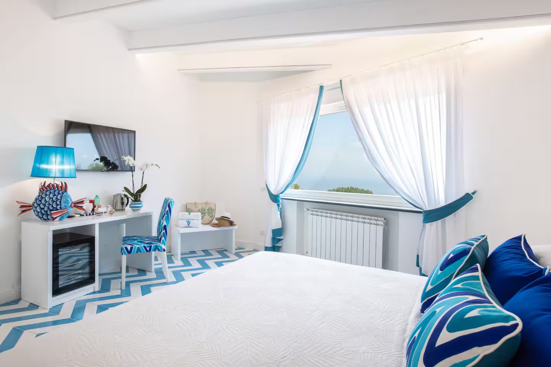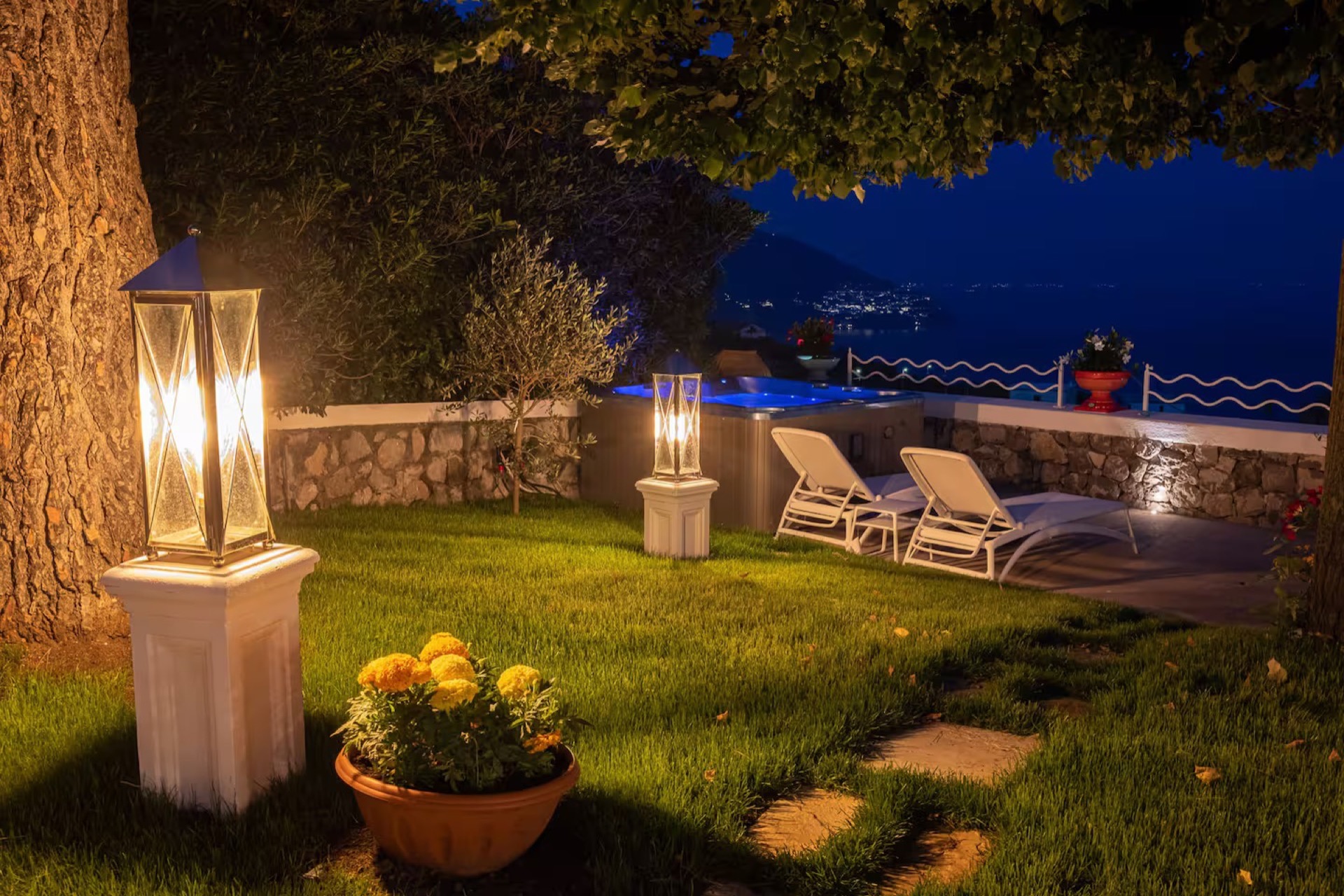 The elegant Positano and Capri Suites, decorated with Vietri ceramics and fine fabrics, provide bright and welcoming spaces, each equipped with a queen-size bed, single sofa bed, and a private heated jacuzzi with sun loungers and an outdoor dining area.