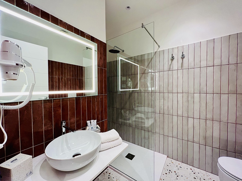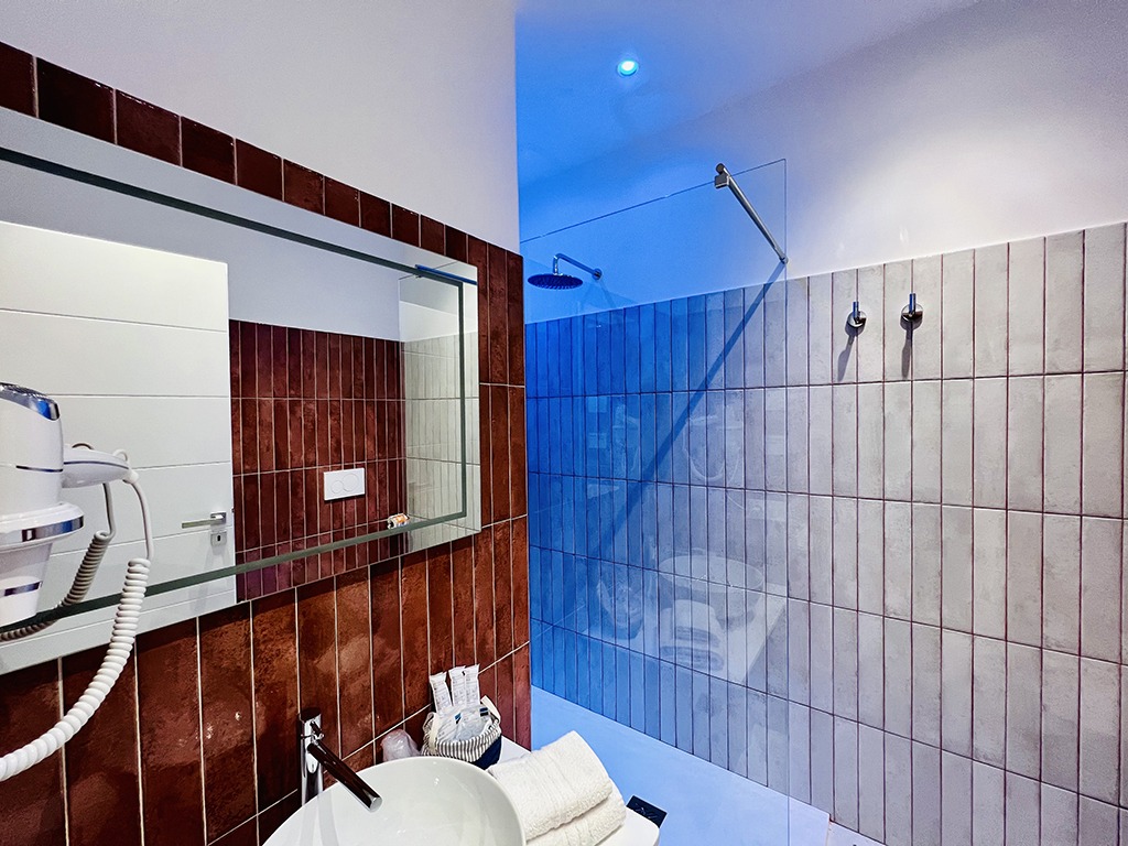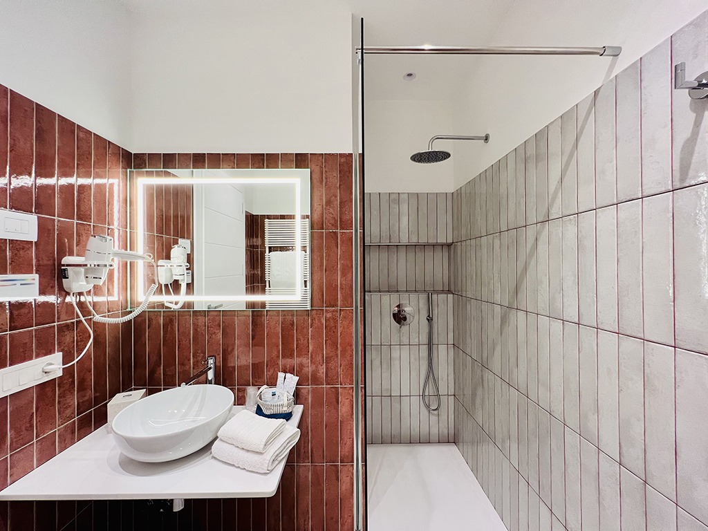 Gli eleganti bagni, rifiniti con una raffinata posa di piastrelle, sono dotati di moderne docce che regalano un’esperienza lussuosa e rigenerante. L’attenzione ai dettagli nella scelta e nella lavorazione dei rivestimenti crea un’atmosfera esclusiva, garantendo momenti di autentico benessere.