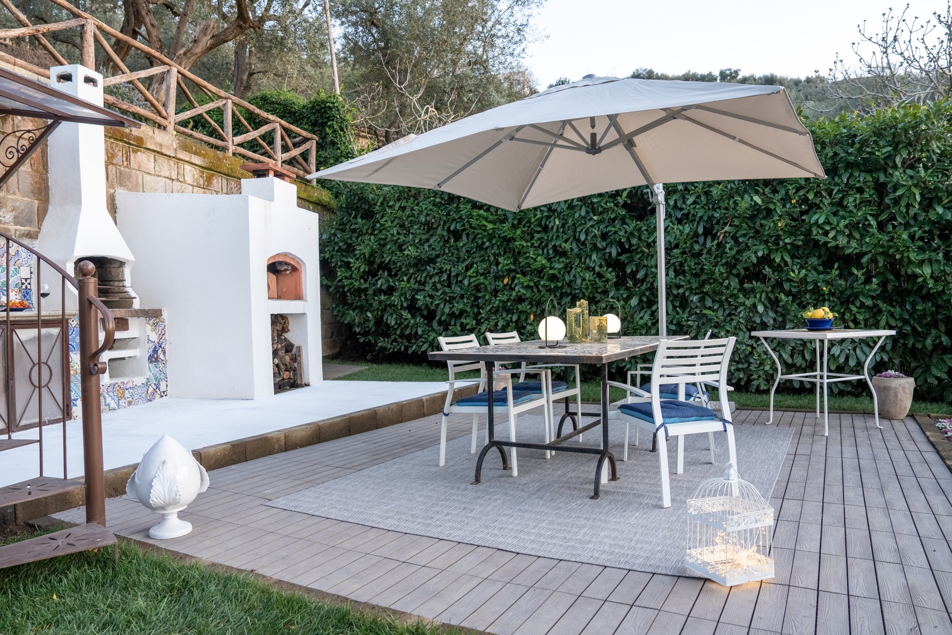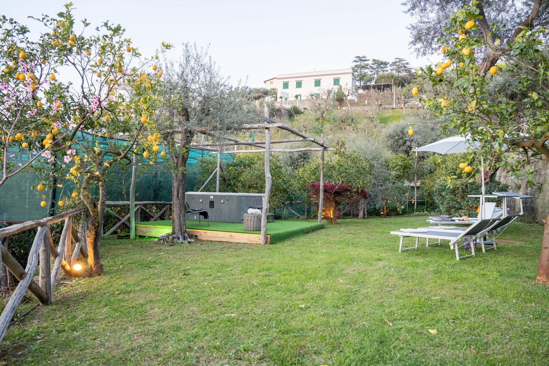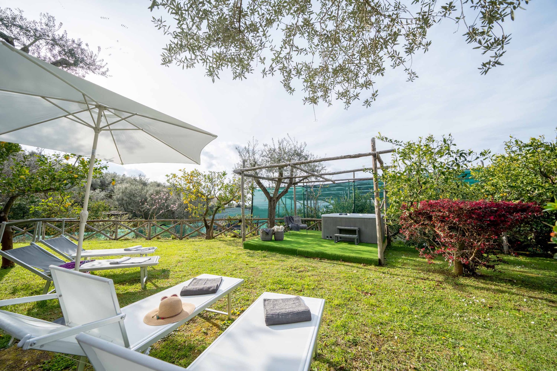 La casa è dotata di aria condizionata, wifi, lavatrice, ed è composta da 3 camere da letto, 2 bagni, e può ospitare fino a 6 persone. Lo spazio esterno è costituito dall' ampio giardino e arricchito da barbecue, zona pranzo all'aperto, forno a legna, zona solarium con Jacuzzi.