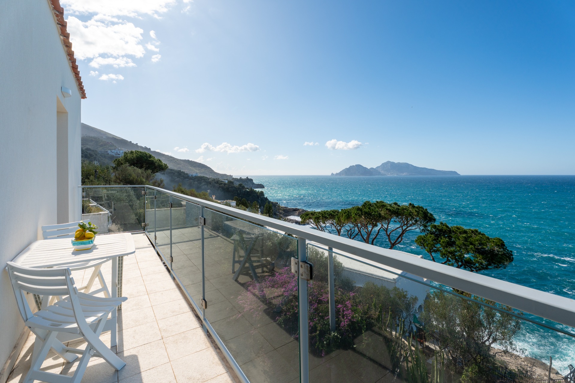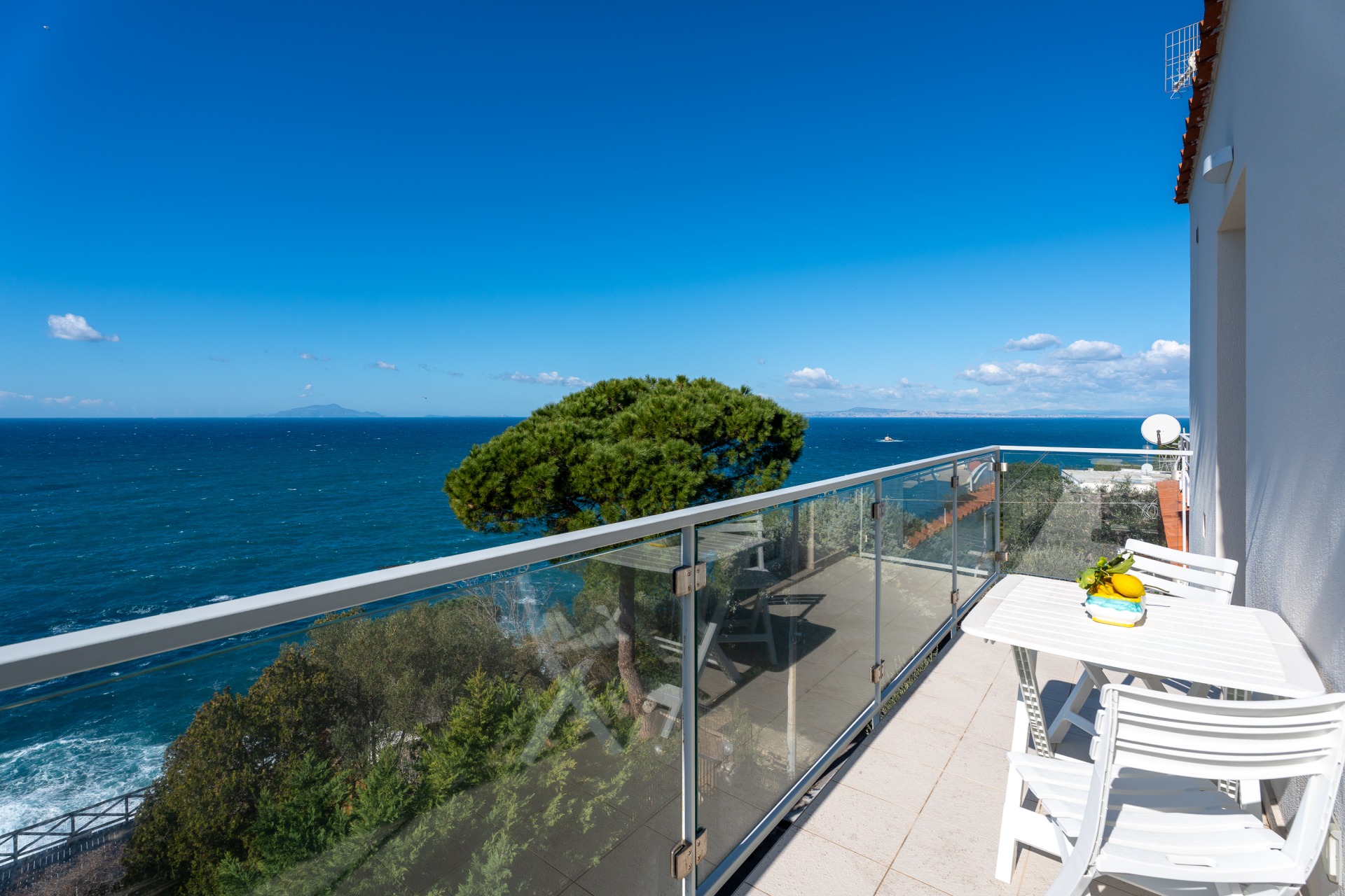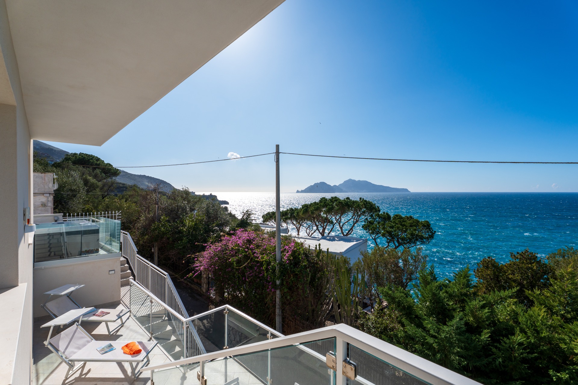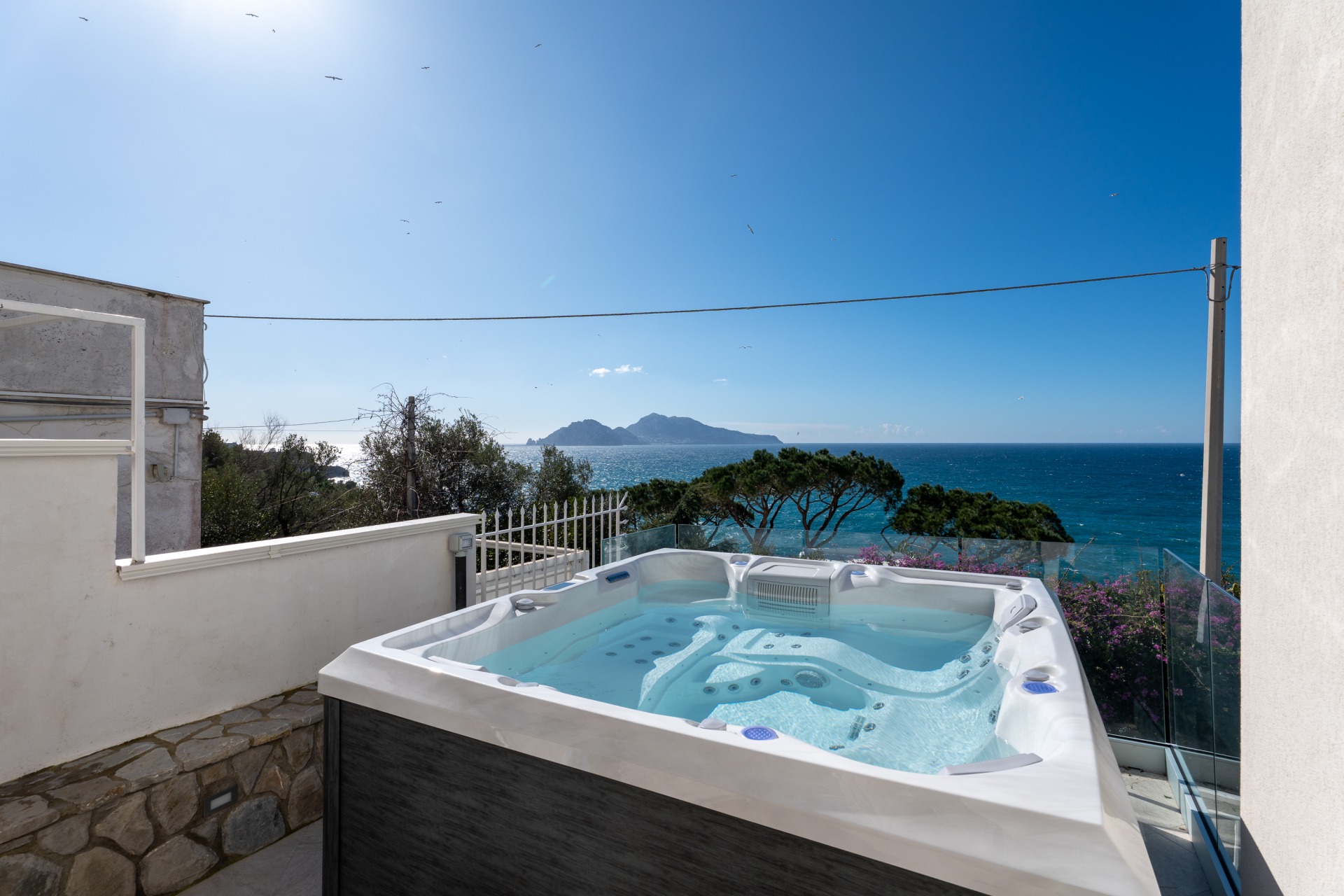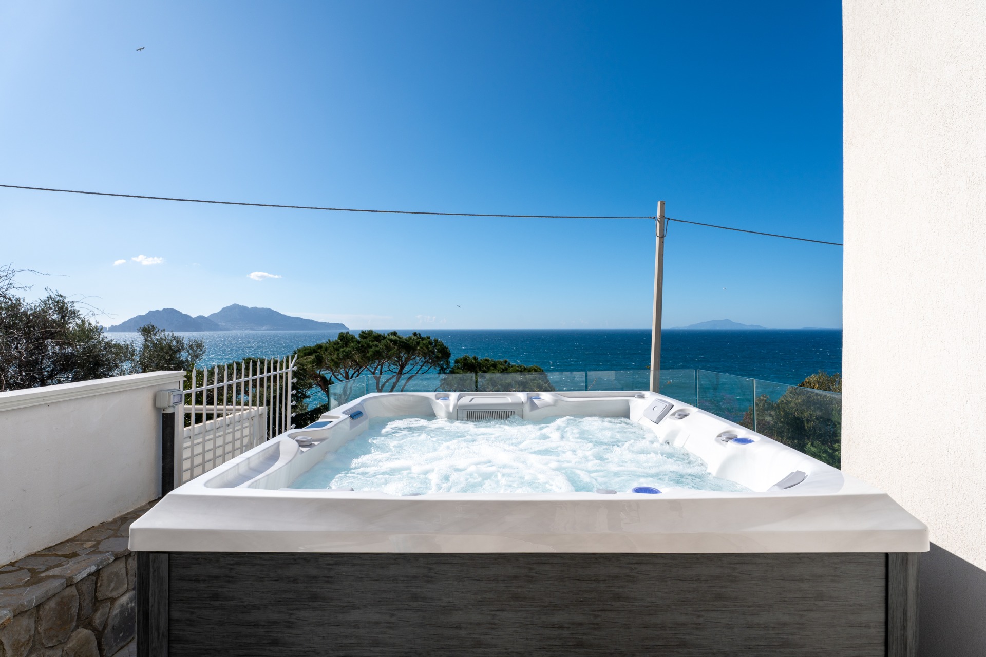 Villa panoramica a Massa Lubrense con vista mare mozzafiato su Capri. Disposta su due livelli, offre 3 camere, di cui 2 matrimoniali vista mare con balcone (1 con bagno ensuite) e 1 singola, 2 bagni aggiuntivi, ampio open space con cucina moderna e soggiorno luminoso. All’esterno jacuzzi privata panoramica e area pranzo all’aperto. Parcheggio privato per 2 auto (1 media e 1 piccola). Relax e panorama in posizione esclusiva.
