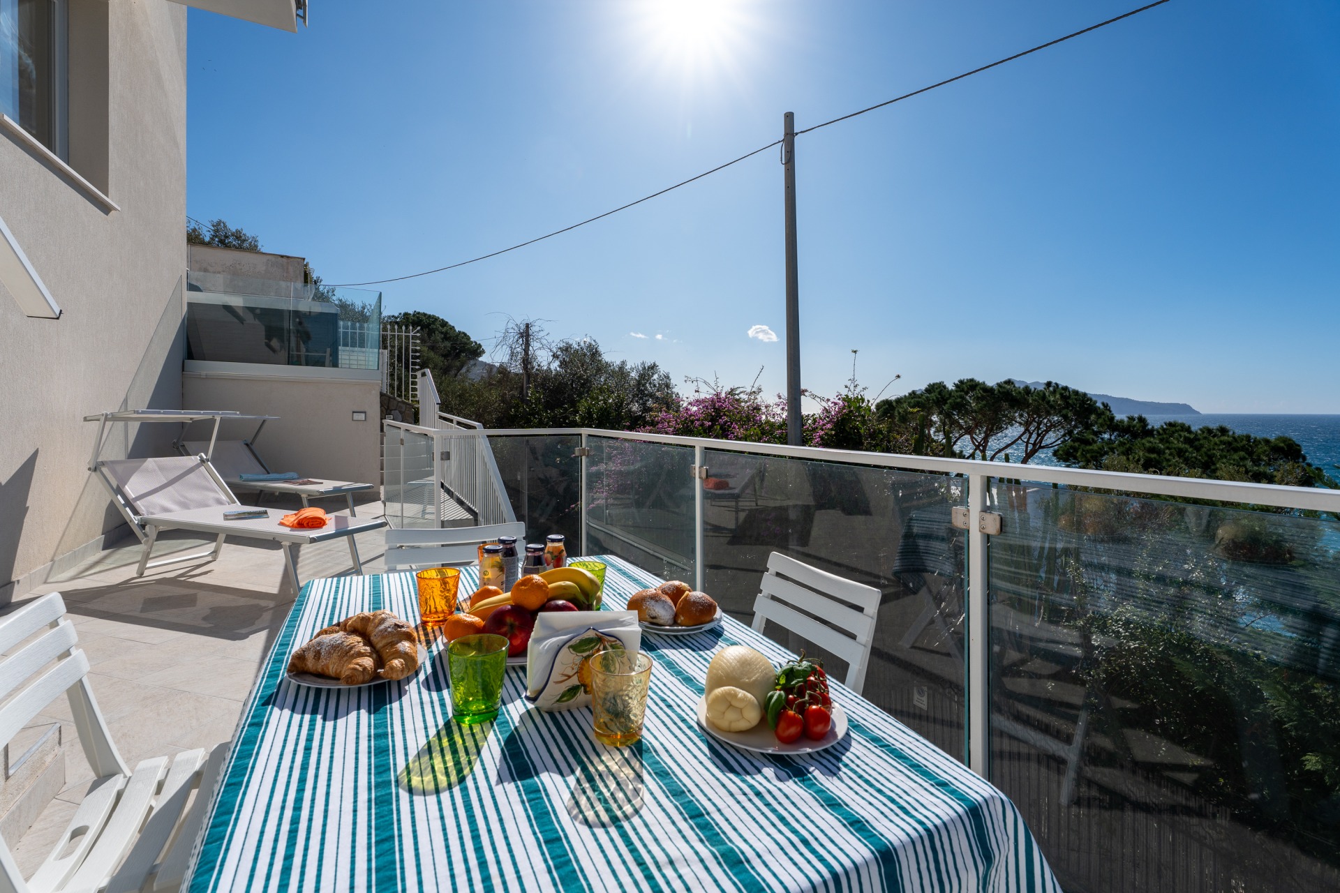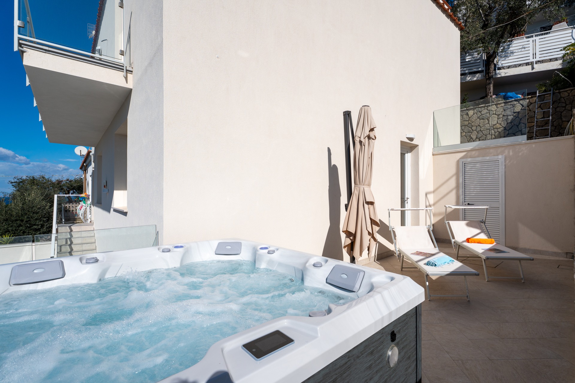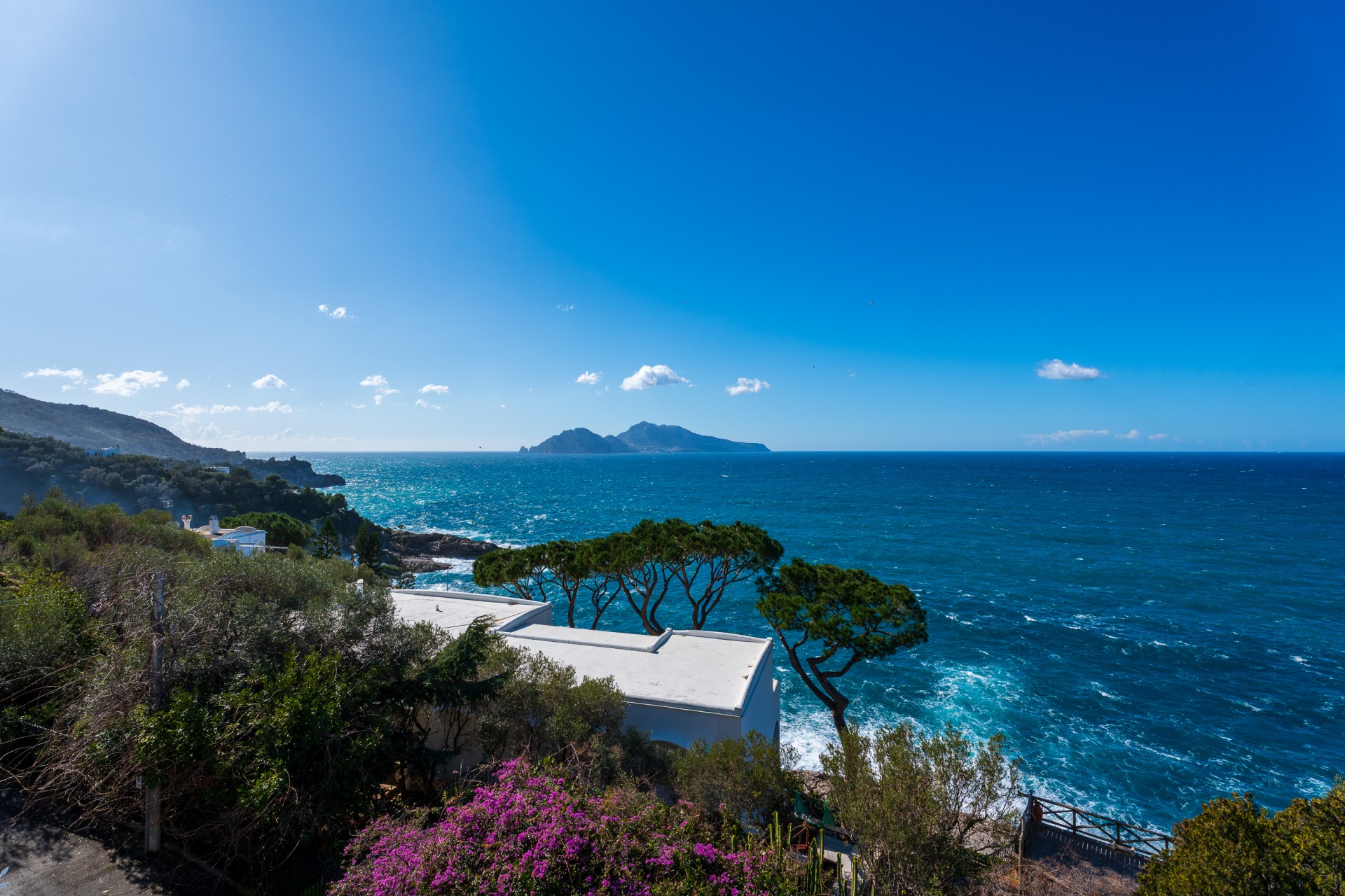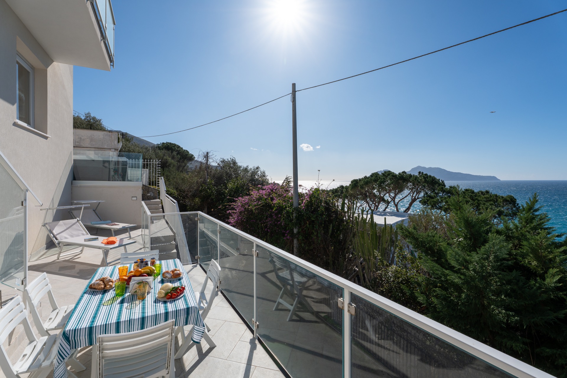 Villa panoramica a Massa Lubrense con vista mare mozzafiato su Capri. Disposta su due livelli, offre 3 camere, di cui 2 matrimoniali vista mare con balcone (1 con bagno ensuite) e 1 singola, 2 bagni aggiuntivi, ampio open space con cucina moderna e soggiorno luminoso. All’esterno jacuzzi privata panoramica e area pranzo all’aperto. Parcheggio privato per 2 auto (1 media e 1 piccola). Relax e panorama in posizione esclusiva.